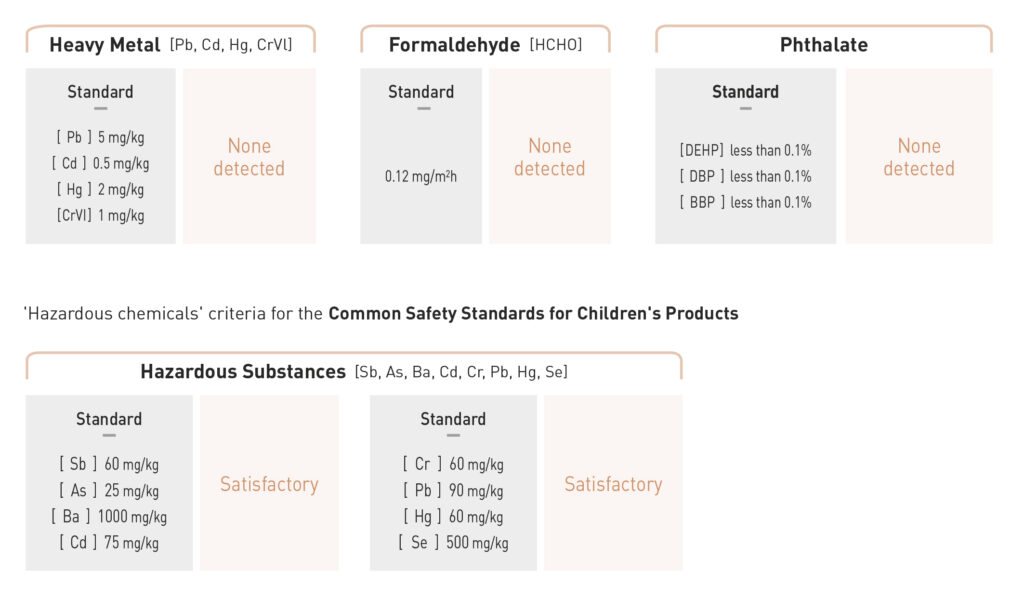 - Meets the safety requirements for hazardous chemicals in the Common Safety Standards of Children’s Products.