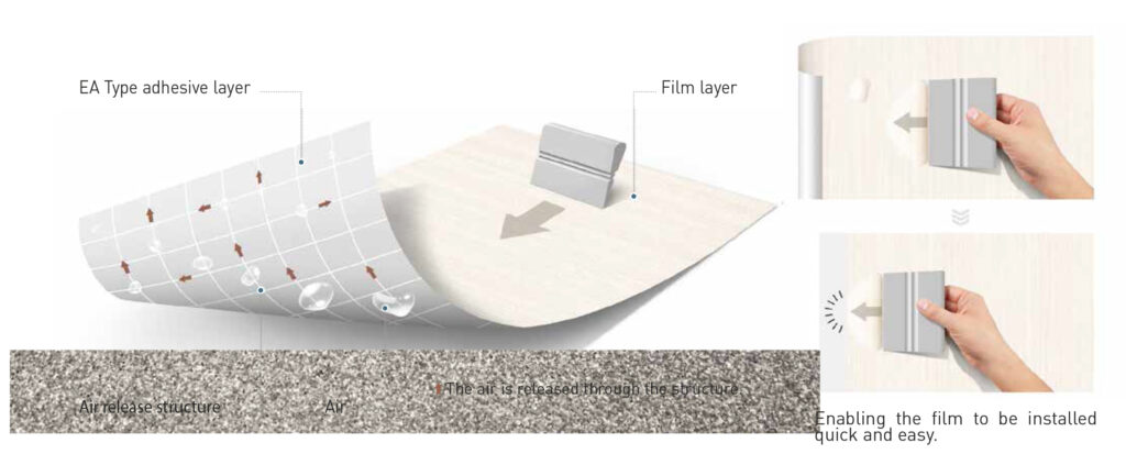 The air is released along these grooves, enabling the film to be quickly and easily affixed to large or complex surfaces. This provides a higher quality finish.