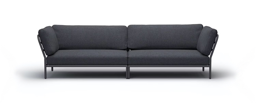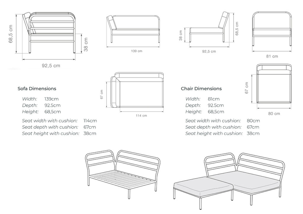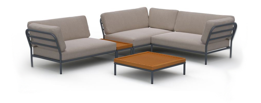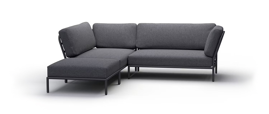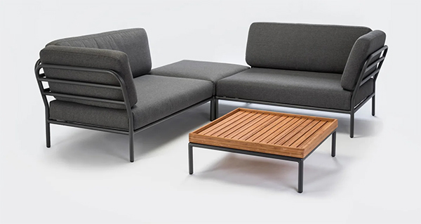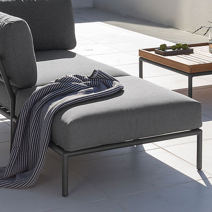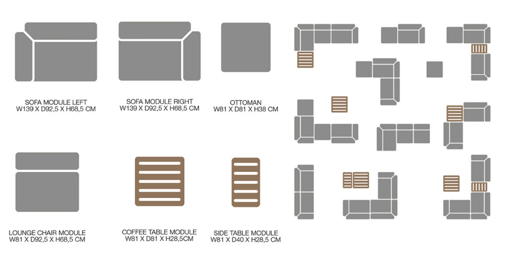 The collection consists of 2 sofa end modules – one left and one right, a lounge chair module and an ottoman, all with powder coated steel frame and cushions in water resistant fabric. To complement the couches we also offer a coffee table and a side table.